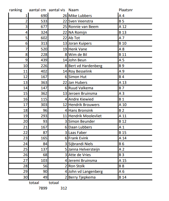 Ondanks het ruige weer kon de wedstrijd gelukkig doorgaan. Er werd bovendien aardig wat vis gevangen voornamelijk schar, bot en wijting. De deelnemers visten tot 14:00 uur, waarna ze konden genieten van een heerlijke kop snert in De Harmonie. Daar vond aansluitend ook de prijsuitreiking plaats.